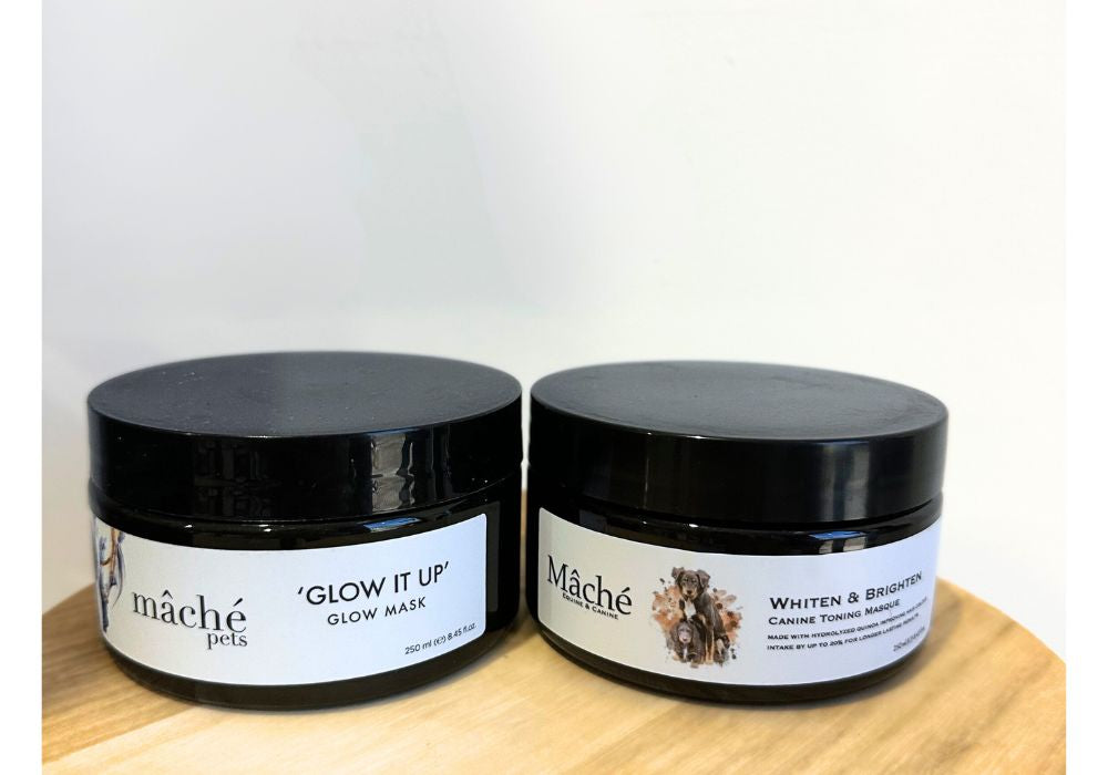 Mâché Pets Glow It Up or Whiten & Brighten Glow Mask (same product) utilises a special pigment to brighten white and grey coats or markings. Sold as single product.