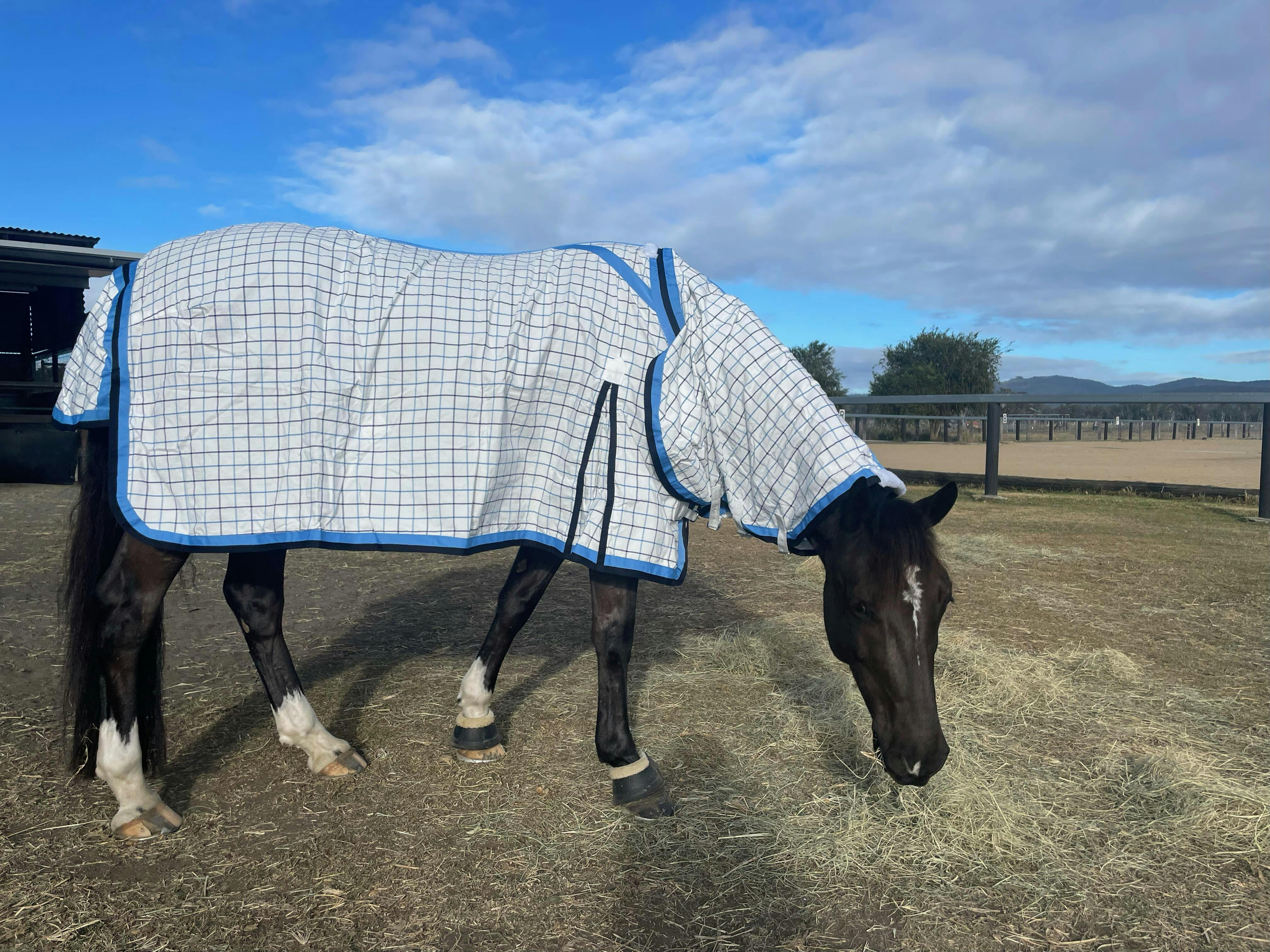 To find what size rug your horse needs, please take a measuring tape and place in the centre of your horses chest (where the top chest buckle would sit) past the shoulder, along the side towards the rump to the longest point, making sure to stop before you get to the tail.